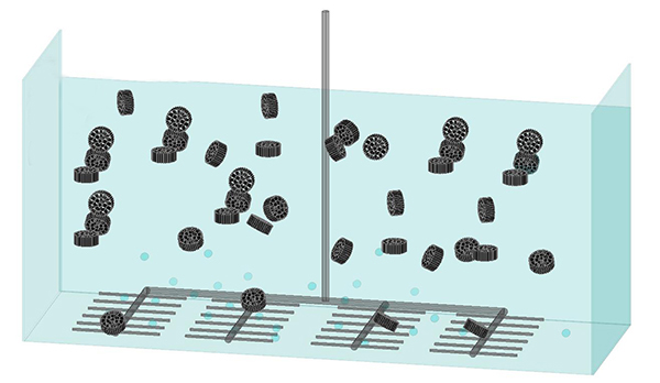 純膜MBBR是一種純粹的生物膜法處理工藝,系統(tǒng)不設(shè)置污泥回流,污染物的去除全部依賴于附著態(tài)生物膜。此工藝具有容積負(fù)荷高、占地面積小、運(yùn)行穩(wěn)定高效等特點(diǎn)。